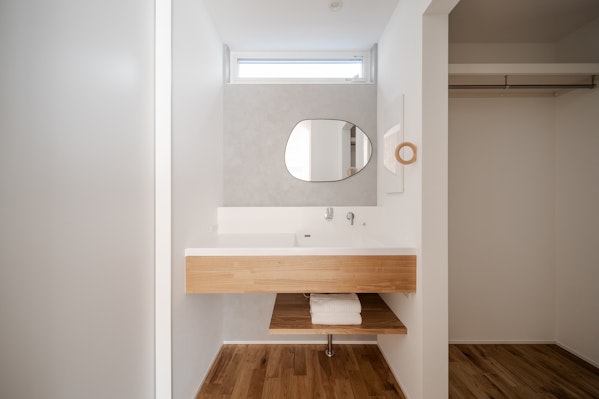 特徴的なニュアンス鏡がシンプルな空間にアクセントをつける。