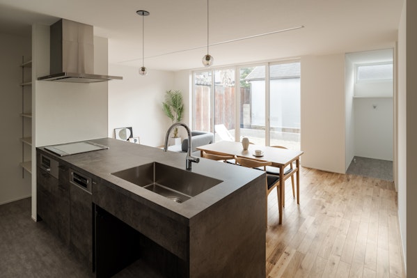 グレーのキッチンは、落ち着いた雰囲気にピッタリで汚れが目立ちにくい。