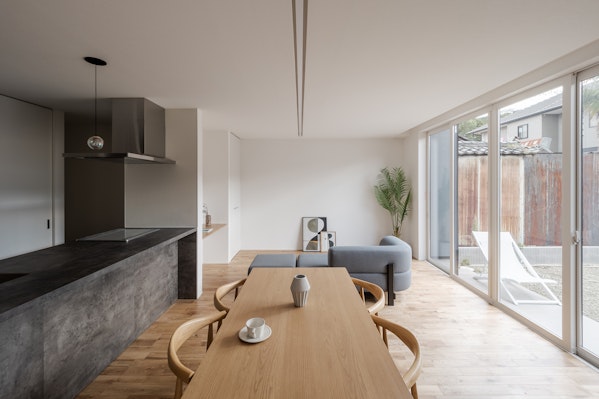 大きな窓がある、スッキリとしたリビングで暮らす平屋